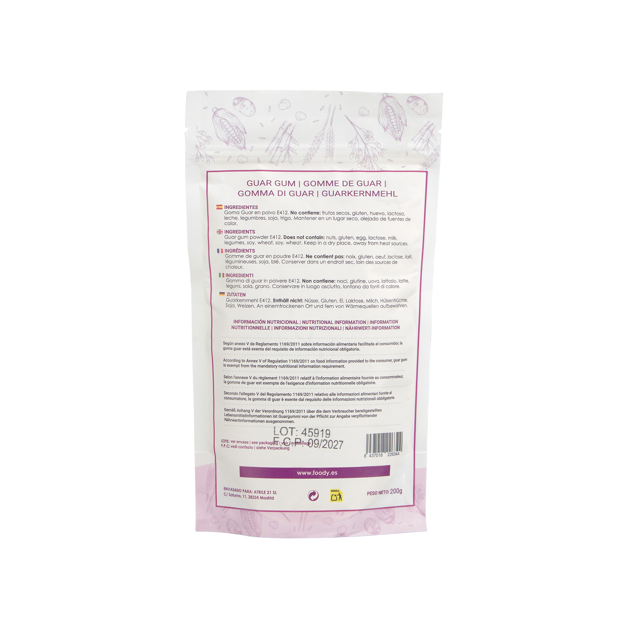 La goma guar es una fibra soluble que se obtiene por prensado de las semillas de la planta leguminosa Cyamopsis tetragonoloba, originaria del continente asiático. Muy útil en muchas recetas sin gluten, es además, un espesante natural. Aporta elasticidad y volumen a las masas de repostería. Es un potente agente espesante, que puede utilizarse tanto en frío como en caliente.
